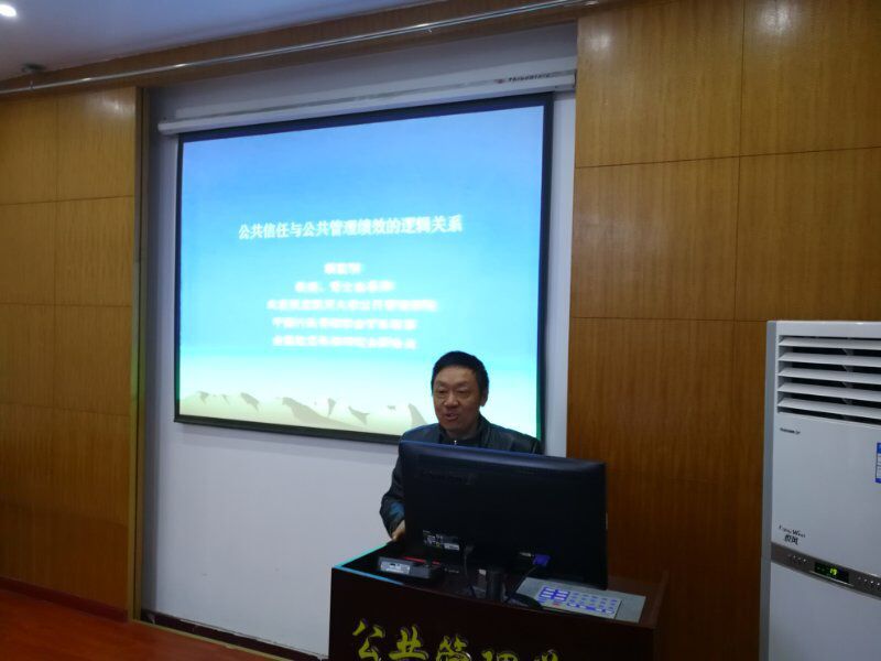胡教授演讲主要分为四个部分。第一部分介绍了信任的概念、影响信任的要素,以及提出了四个与公共信任有关的问题。第二部分分析了公共信任与公共管理绩效的逻辑关系,并且针对公共管理绩效=政府目标实现×公共管理效率提出的命题了理论假设,假设分为两个大的方面,即公共信任对公共管理效率具有正相关性、公共信任对政府目标实现程度具有正相关性。第三部分,胡教授对前面提出的假设进行了初步验证,用具体的案例从三个方面分析目前中国公共信任现状及其与政府绩效关系,一是对目前中国公众对政府信任的总体状况分析,二是对中国公众对政府信任度与公众对政府的绩效评价的相关性进行分析,三是公众对政府的信任度与政府目标实现程度的关系分析。第四部分胡教授对本次报告进行了总结并且提出了相关建议。