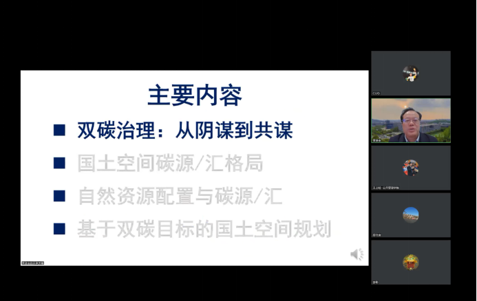 本次讲座黄教授围绕“双碳治理:从阴谋到共谋”、“国土空间冲突与碳汇损失”、“国土空间优化与碳源/汇”、“基于双碳目标的国土空间规划”四个议题进行系统阐述。首先,黄贤金教授从全球气候变化下“双碳治理”的背景出发,讲述了国内外学界诸多专家学者对于低碳发展研究的过程变化;其次,基于全球气候变化对自然资源系统和人类发展影响,黄教授详细介绍了我国经济转型与碳排放之间存在的关系,以及省域之间、各行业之间碳排放总量的差异。接着,黄教授就国土空间与碳源/汇之间的关系,从“自然—社会”二元碳循环特征方面出发,系统揭示碳源/汇对土地利用/覆被变化的时空响应,并运用生态系统碳汇核算方法,构建了“要素-核算-清单”的中国土地利用碳排放数据库。最后,基于“双碳治理”的视角,黄教授通过理论与实践相结合,深入浅出地讲述了碳减排路径及其建设空间约束、土地整治的碳效应、食物系统碳排放与耕地进出平衡等方面研究的创新路径。