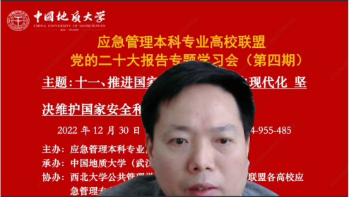 (应急管理学院)、联盟各高校应急管理专业虚拟教研室和武汉市黄鹤应急救援队协办的党的二十大报告专题学习会(第四期)成功召开。本次专题学习会的主题为:推进国家安全体系和能力现代化,坚决维护国家安全和社会稳定。与会人员包括来自武汉大学、樱花动漫