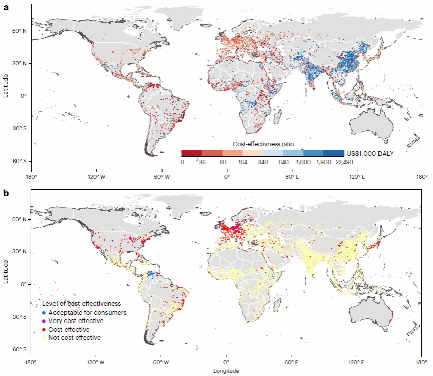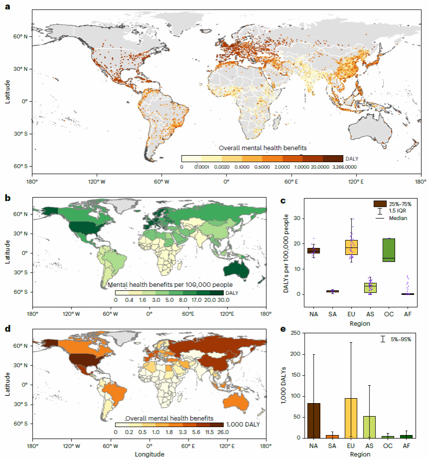 该研究利用多源数据,采用空间分析与健康经济学评估相结合的方法,对全球9034个城市到生物多样性丰富休闲区的可及性、经济可承受性、潜在访问率进行了评估,并估算这些地区在减轻焦虑和抑郁症方面的作用及成本-效益比。结果表明,超过96%的城市在两小时范围内都至少能达到一处生物多样性丰富休闲区(图1)。全球城市居民前往最近的生物多样性丰富休闲区的往返旅行成本占人均国民总收入(GNI)的比例中位数为3.38%(90%范围:0.09%-51.6%)。研究发现到生物多样性丰富休闲区的旅行成本和经济负担在全球分布的非均衡性,欧洲、大洋洲和北美洲城市的经济可承受性和访问率最高(图2)。生物多样性丰富的休闲区在减少抑郁症和焦虑症方面具有可观的效益,在欧洲、北美洲和南美洲的发达地区,具有良好的成本效益(图3和图4)。