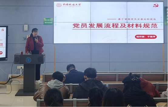 随后,党委组织部专职组织员于荣萍进行《党员发展流程及材料规范》培训。于老师结合《中国共产党发展党员工作细则》规定和具体案例,详细介绍了党员发展的组织流程和党员发展过程的材料规范。培训过程中各学院党务工作者就发展党员工作中遇到的问题和疑惑进行了讨论交流,分享了自身工作经验。
