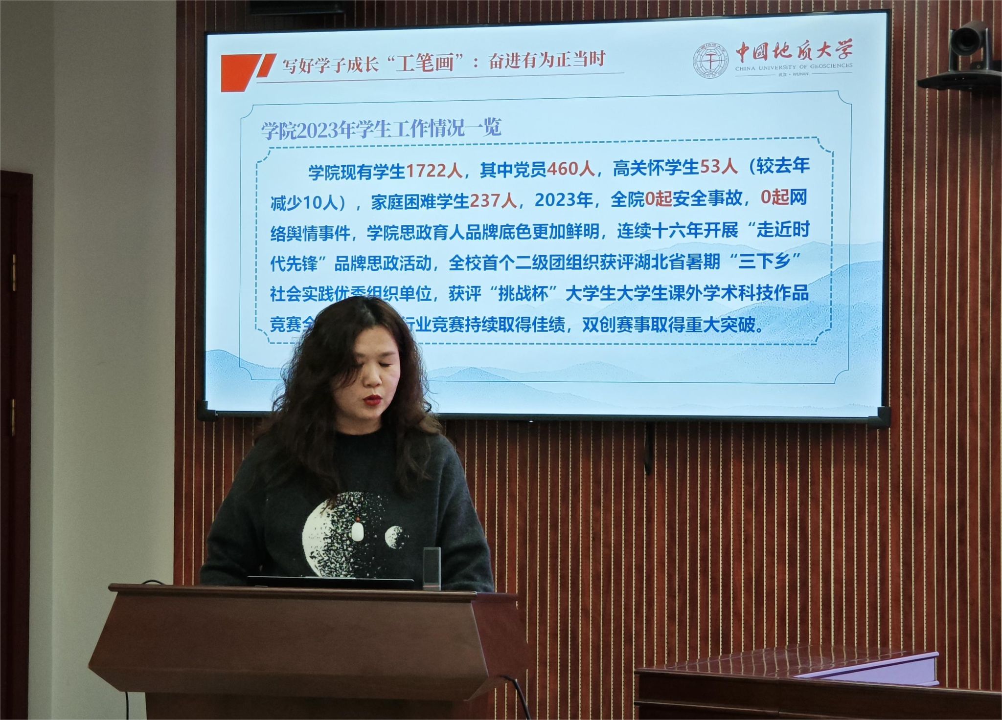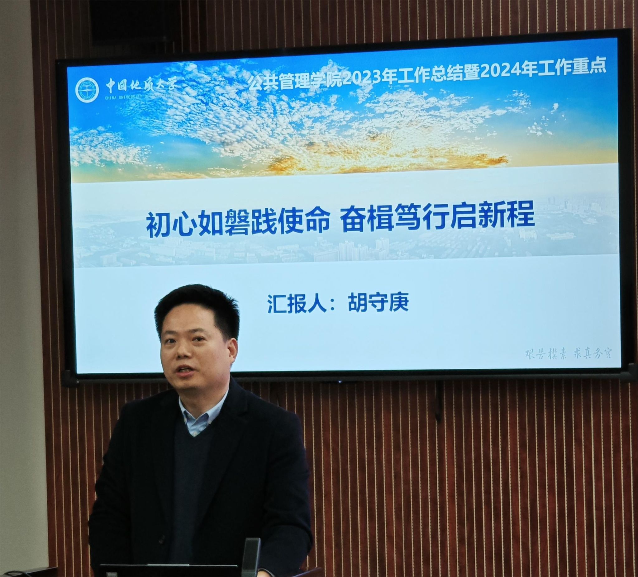 会议分为四个阶段。第一阶段,胡守庚院长作了题为《初心如磐践使命 奋楫笃行启新程》的工作报告,回顾学院2023年工作成效,展望2024年工作。他讲到,2023年是公共管理学科提档升级和法学学科创新发展之年,学院各项事业取得长足进步。2024年,学院要贯彻落实学校十三次党代会精神和双一流建设发展任务,聚焦标志性成果建设、特色新型智库建设、教师队伍发展建设等三大发展方向,进一步推进学院高质量发展。