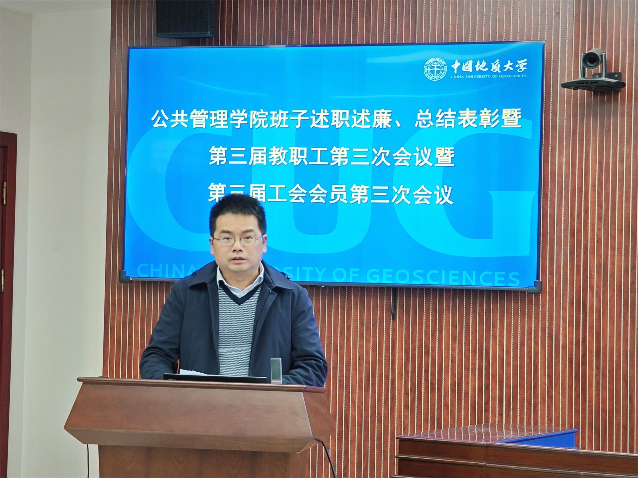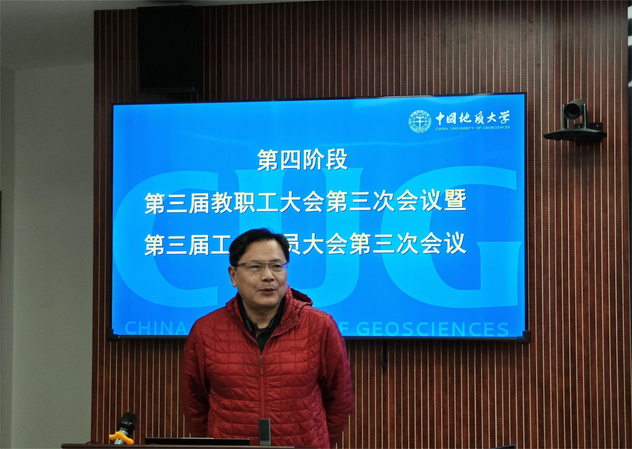 会议第四阶段,进行第三届教职工大会第三次会议暨第三届工会会员大会第三次会议。工会主席曾伟向全体工会会员报告工会工作,院长胡守庚作学院财务公开报告。大会以举手表决方式选举彭涛教授为学院新的工会主席。