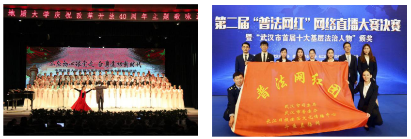 七、兴趣特长展示:2018年,学院法律协会荣获2018年学校“十佳社团”。学院主持人社“我与诗歌有故事”朗诵大赛、胶典摄影队第二届“胶典杯”摄影大赛、法律协会模拟法庭顺利入选学校第十九届大学生文化艺术节青年文化旅行社导游团。学院学子2017级林泽阳等同学参演我校原创话剧“大地之光”。学院荣获学校“纪念改革开放40周年”主题歌咏比赛“最佳表演奖”。学院辩论队荣获华中地区“政管杯”辩论赛冠军。荣摘第二届全国“普法网红”网络直播大赛(辩论赛选拔赛)桂冠,2018级硕士生赵淼峰、2016级本科生任雨晴荣膺“武汉市普法形象大使”。