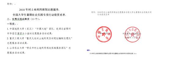 2019年5月30日,由中国土地学会、中国青年志愿者协会联合组织行业知名专家,结合成果完备程度、活动组织秩序、社会影响程度、成果应用价值、成果创新水平等因素,评选优秀实践团队12个(一等奖3个、二等奖4个、三等奖5个),优秀实践成果13个(一等奖3个、二等奖5个、三等奖5个)。樱花动漫
