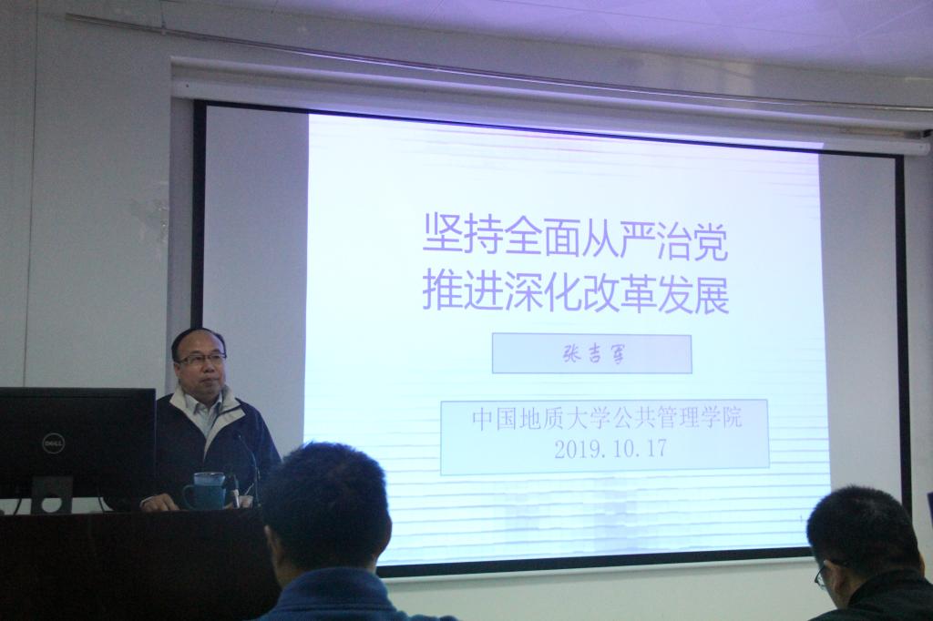 会议伊始,刘国华副书记对本次党课的主题进行了简单介绍。随后,张吉军书记从“坚持党对一切工作领导为依据的制度安排”“新时代党的建设总要求”“推动全面从严治党向纵深发展”“结合实际 坚守初心 锐意改革”四个方面进行了阐述。