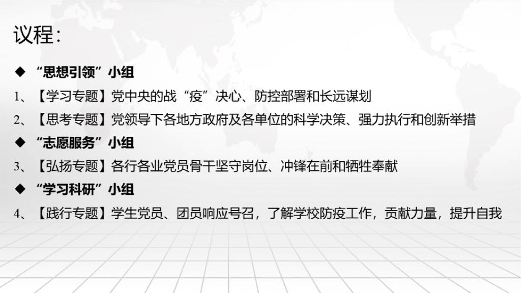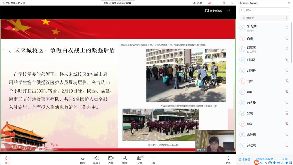 宣传委员刘寒寒同学分享了学校疫情防控相关工作动态,如为地大社区提供楼栋住户信息排查、配送居民生活物资、转运生活垃圾等服务所成立的封控应急工作队;在学校党委部署下,地大将未来城校区3栋尚未启用的学生宿舍供援汉医护人员周转居住;留学生组成一支名叫“钢铁侠”的志愿队为学生们服务;地大教师患新冠肺炎治愈出院心怀感恩捐献血浆救治更多患者等感人事迹。面对疫情,地大人不但自身坚守初心、坚守岗位、坚守承诺,而且积极承担社会责任,协助地方政府做好有关服务保障工作,诠释了地大人“艰苦朴素、求真务实”的校训精神。