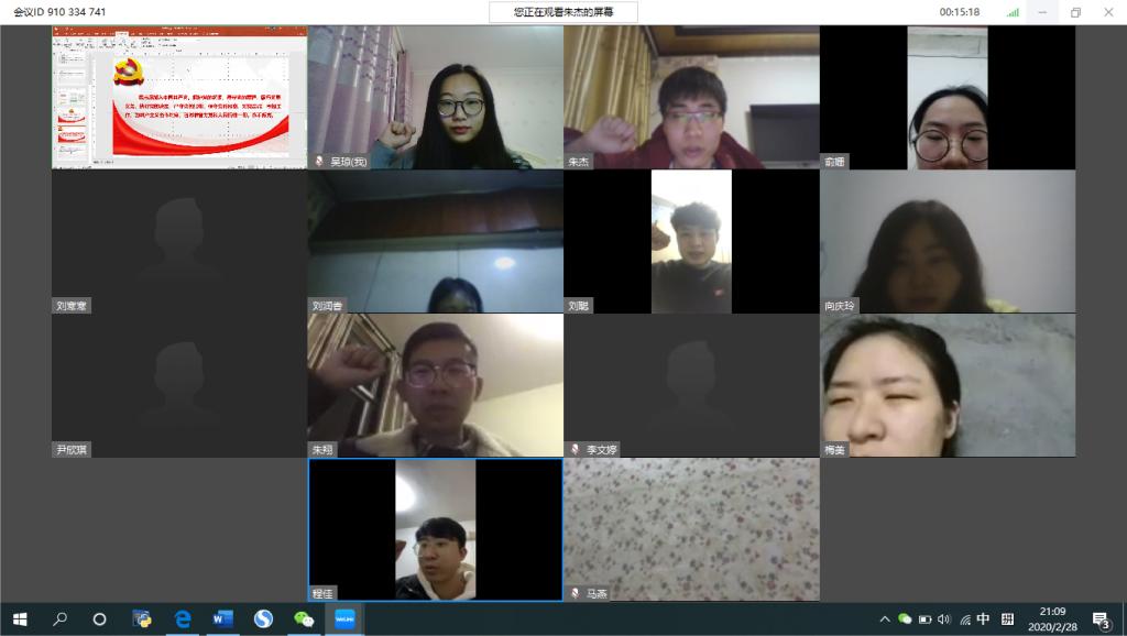 支部书记朱杰同学组织各位党员、团员认真学习了习近平总书记关于疫情防控工作的重要讲话以及中共中央、湖北省纪委机关、湖北省委组织部有关文件精神,在此基础上了解各地方政府和单位的准确判断、决策以及创新性的防疫举措,促使支部成员意识到作为一名学生党员、青年团员的责任与使命,勇于担当,坚定信念,严于律己,充分发挥先锋模范作用,为打赢疫情防控阻击战提供坚强的政治保证。