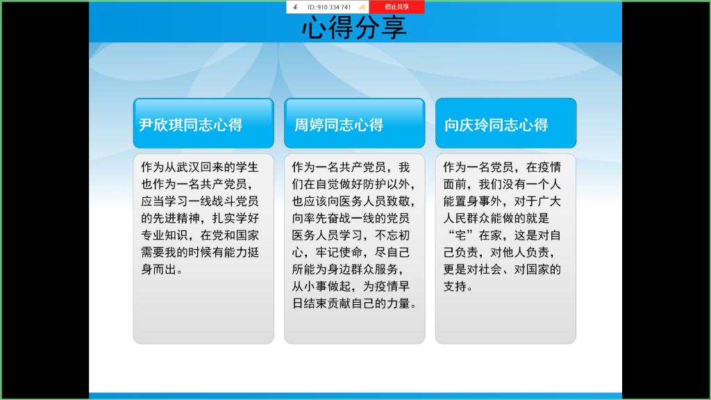 预备党员梅美同学分享了广大党员、干部、医务工作者冲锋在前、顽强拼搏,在抗击疫情的战斗中涌现出的一大批先进人物和典型事迹,如17年前奋战在抗击非典型肺炎一线的钟南山院士再次奔赴武汉;武汉金银潭医院院长张定宇,拼了性命与死神争分夺秒抢救病人;29岁的武汉市江夏区第一人民医院呼吸与危重症医学科医生彭银华,在疫情面前延迟婚期主动请战;红旗社区普通居民董继萍把人民群众的身体健康和生命安全放到第一位。这样的模范还有很多,虽然我们不能记住每一位“逆行者”的面容与名字,但我们会永远记得举国上下团结一致、共克时艰的力量。