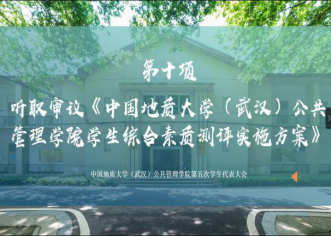 相信新一届代表能以本次大会为契机,不忘初心,牢记使命。正如习近平总书记在致全国学联二十六的贺信中写道“学联事业是党的群团事业的重要组成部分,学联组织一定要不断保持和增强政治性、先进性、群众性,更好组织动员广大青年坚定跟党走。”进一步领导学生们积极投身学校学院建设与发展,为实现中国梦、地大梦、公管梦、个人梦奠定更加坚的基础。
