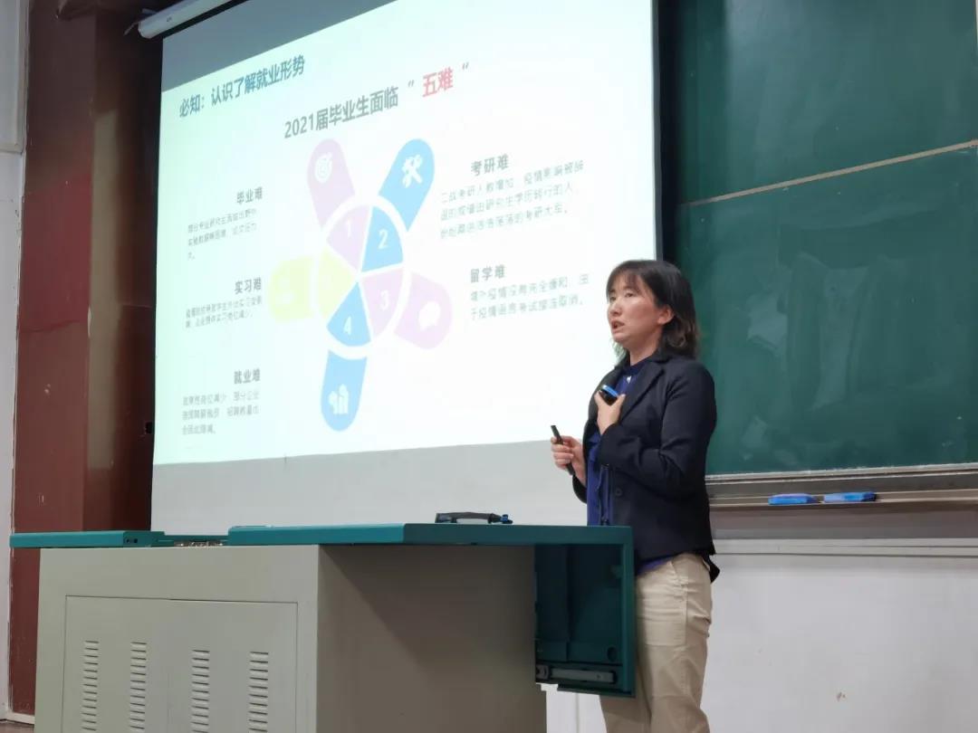 于11月12日晚七点在教三楼举办2021届毕业生就业推进会,就业指导中心副主任郭玉凤老师、学校校园招聘部讲师团团长侯依彤同学、毕业年级辅导员吴波、王青涛、兼职辅导员周佳仪和2021届全体在校本研毕业生参加会议。