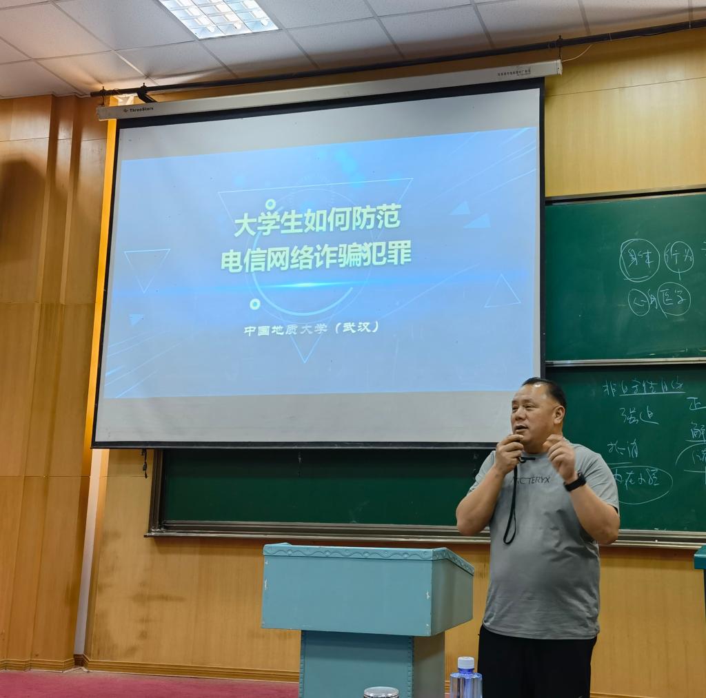 之后,单处长大力提倡同学们认真学习“地大保卫”提供的网上防诈骗课程,相信大家学完以后一定大有收获。最后,单处长强调,如果遇到诈骗,不要慌张,要及时向老师和学校反映,及时报警,并以一句话作为总结——“绷紧防范弦,捂紧钱袋子”。