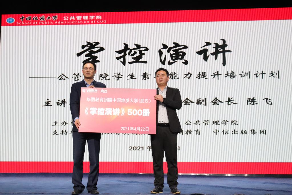 学院党委副书记刘国华代表学院接受华图教育捐赠的500册《掌控演讲》图书。