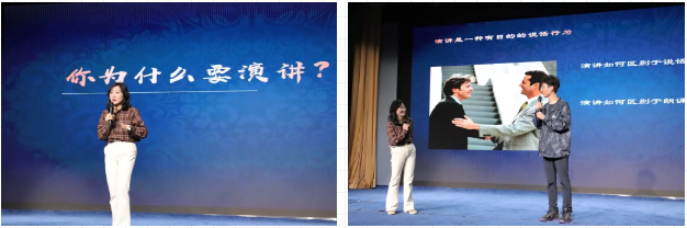 接着,陈飞老师从演讲的目的和演讲的力量两个方面,为我们解答“为什么要演讲”。她通过分享自己的经历引出了演讲的目的——引领思想,传播理念。她认为演讲不是为了比赛和获奖,而应该是倡导一种精神,传达一种理念。