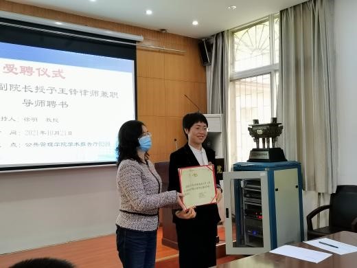 讲座伊始,徐明教授介绍各位嘉宾后由才惠莲副院长授予王锋律师兼职导师聘书。
