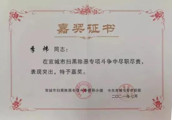 凭着在专项斗争过程中的勇挑重担、敢于担当,2019年季炜被安徽省人民检察院评为全省检察机关扫黑除恶先进个人,2021年被评为宣城市扫黑除恶专项斗争先进个人。
