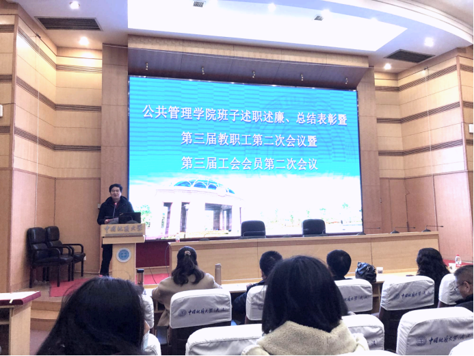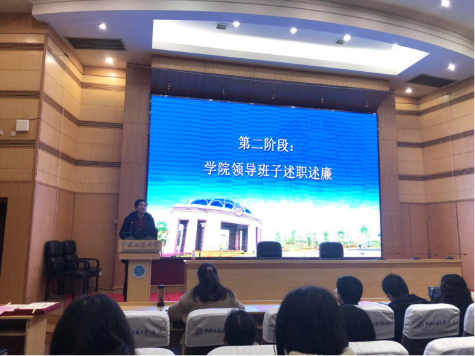 会议第二阶段,学院领导领导班子张宽裕、胡守庚、才惠莲、龚健、王忠、李世祥、朱江洪、龚丽依次述职述廉。