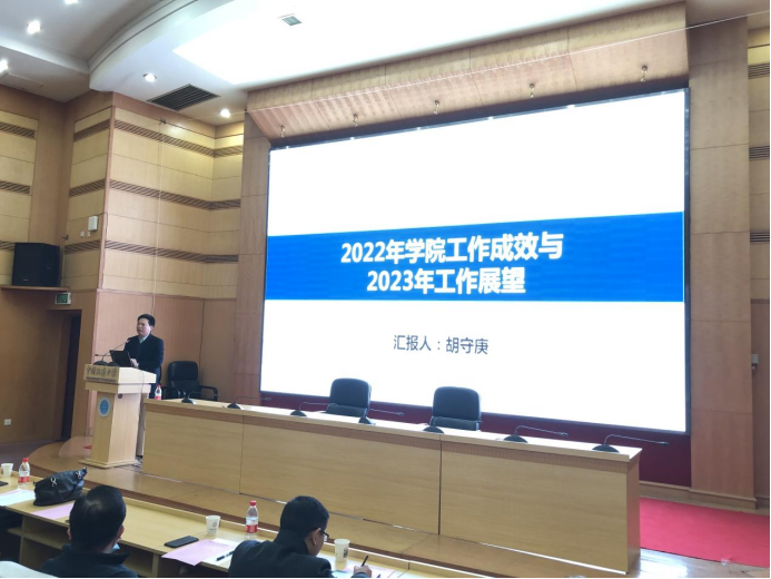 会议分为四个阶段。第一阶段由院长胡守庚报告2022年学院工作成效及2023年工作展望。他讲到,2022年是公共管理学科跨越式发展和法学学科高质量发展的关键时期,学院各项事业取得长足进步。他从公共管理学科发展的十大关键入手,围绕学院“十四五”发展目标,阐释了学院2023年工作思路、计划和目标,提出学院要加强目标管理,进行学院绩效管理改革,要坚持创新驱动,提升教师创新能力,坚持开放合作,汇聚学科发展新动力,坚持推进有组织创新构建学院发展新格局。
