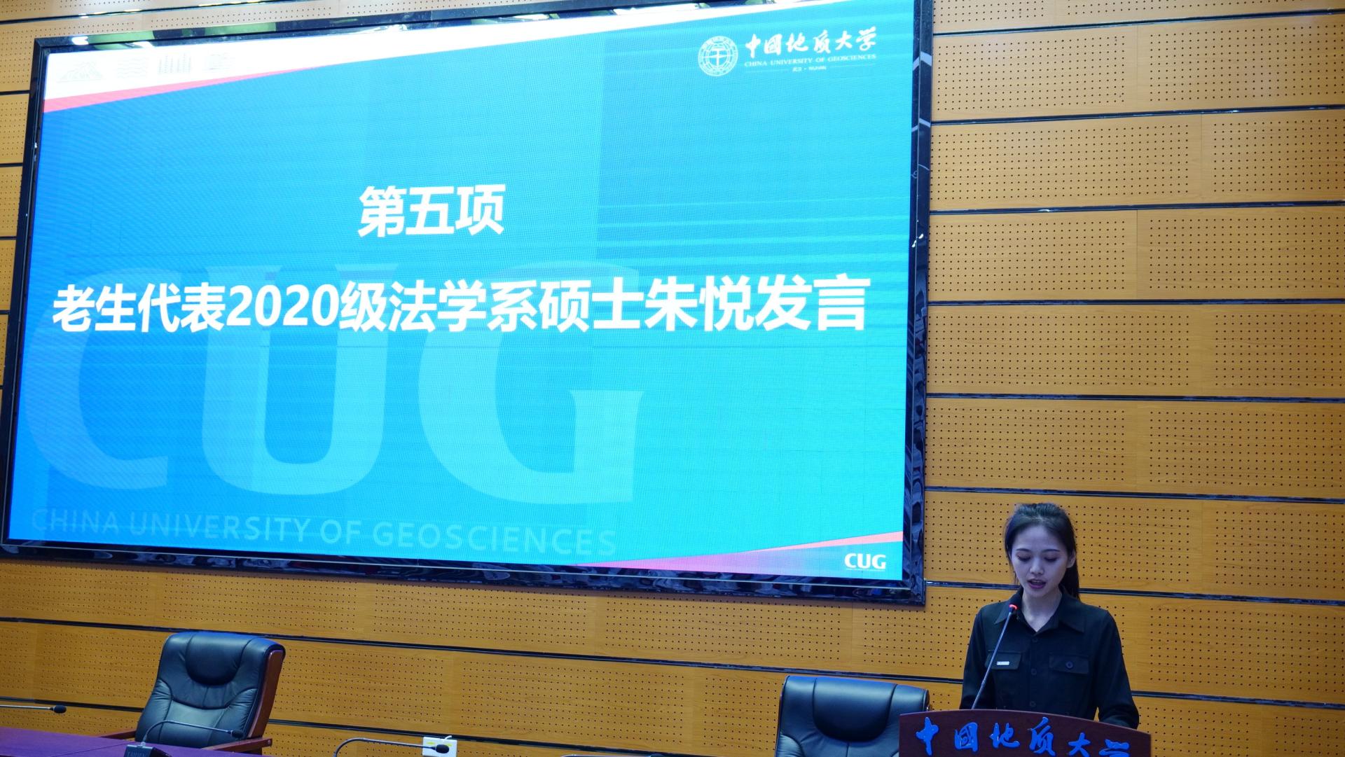 法学系2020级硕士生,2023年校研究生标兵获得者朱悦作为老生代表发言。她结合自身在地大、在学院的成长故事,从“定位”、“突破”和“担当”三方面希望同学们能够充分把握学校和学院提供的资源平台,找准自身定位,勇于创新突破,矢志担当作为,全力“跑”出新时代公管人的“加速度”。
