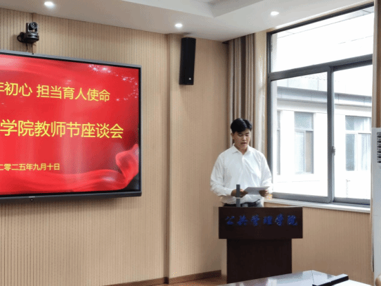 随后,教师代表依次分享心声。才惠莲回顾学院近年科研领域的蓬勃发展态势,坦言为团队中爱岗敬业的教师同仁与高效有力的领导集体深感自豪,对学院未来发展充满信心;唐健表示,加入公管学院是无悔的选择,作为教育工作者,更需坚守初心,努力成为知识的传播者、思想的启迪者与价值的引领者;向敬伟结合个人成长历程,感谢学院营造的融洽氛围与高效管理模式,并分享了参加省青年教师讲课比赛斩获佳绩的心得;青年教师李烨则讲述了自己成为高校教师的契机,提及学院的支持帮助自己快速完成身份转变,深刻体会到教育事业的神圣使命与价值。