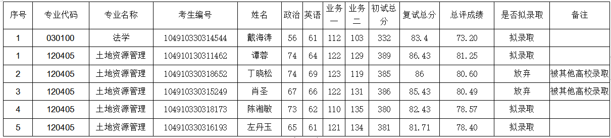 考虑樱花动漫 学科发展需求,经学院申请,研究生院同意,给予樱花动漫 法学专业增加一个指标,土地资源管理专业增加3个指标。现将补录结果公示如下(顺位录取。如有放弃,顺次录取):