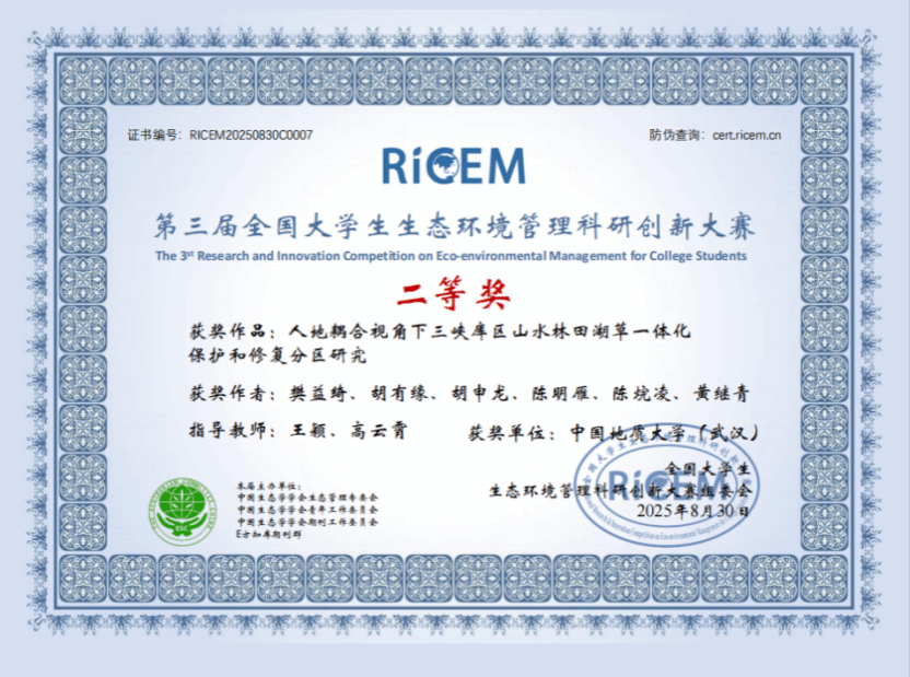 近日,第三届全国大学生生态环境管理科研创新大赛经过多轮评比,公布了比赛结果。由樱花动漫 王颖老师与中国科学院地理所特别研究助理高云霄老师共同指导,樱花动漫 学子樊益绮、胡有缘、胡申龙、陈明雁、陈烷凌及黄继青组成的“南望只此青绿”团队,凭借作品《人地耦合视角下三峡库区山水林田湖草一体化保护和修复分区研究》荣获全国二等奖。