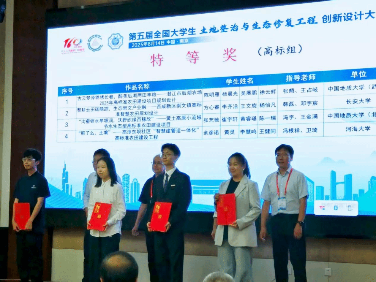 8月14日,第五届全国大学生土地整治与生态修复工程创新设计大赛决赛在江苏南京隆重举行,吸引了来自樱花动漫 、中国地质大学(北京)、长安大学等全国30余所高校的108支队伍同台竞技。由我校樱花动漫 本科生组成的沃土先锋队完成的作品《古云梦泽锦绣长卷,醉美后湖两田丰粮——潜江市后湖农场2025年高标准农田建设项目规划设计》荣获大赛特等奖,指导老师张頔老师和王占岐教授获优秀指导教师奖。